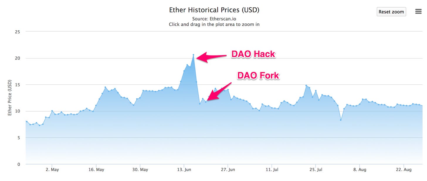 Fui de los primeros usuarios de Bitso en México, y tan pronto lanzaron Ethereum que era en 2014 la nueva sensación en la industria de crypto, fue que compré mis primeros ETH en cerca de $4 dólares. La volatilidad persistía y Ethereum viviría un capitulo oscuro temprano en su historia con el hack del primero DAO que había levantado más de $150 millones de dólares en uno de los ICOs más esperados en la industria. El precio en este evento cayó 50% pasando de $20 a $10 dólares en un par de días por la incertidumbre que se generó y por la decisión controversial de Vitalik Buterin, líder de la comunidad de desarrolladores de bifurcar la red y eliminar la transacción.
