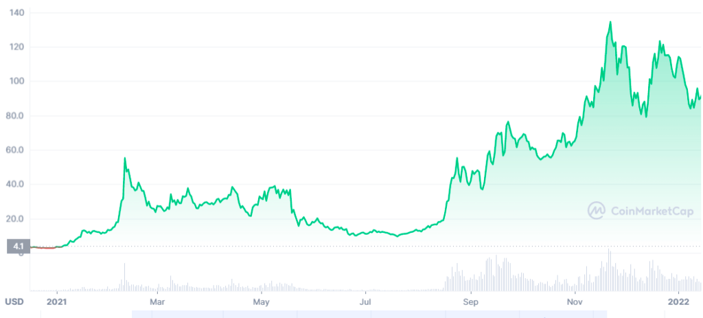 El precio del ICO fue de $0.50 centavos, y a los pocos meses ya estaba cotizando por encima de los $3 dólares. Un rendimiento de 500% en un par de meses es algo totalmente anormal, pero la valuación de AVAX (su token) era una fracción de la valuación de su competencia (Solana, Cardano y el mismo Ethereum). En 2021 los mercados explotaron, los precios subieron de manera precipitada y luego de un vaivén, el valor de AVAX ¡llegó a los $135 dólares! A esos niveles había hecho 270 veces mi inversión inicial.