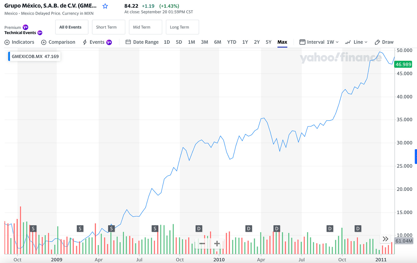 - Grupo México que pasó de estar en menos de $8 pesos en 2009 a más de $50 en 2010